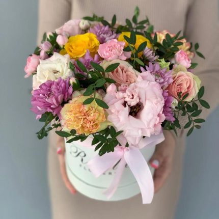 Композиция “Санторини” с розой, лизиантусом, гвоздикой и эвкалиптом в коробке