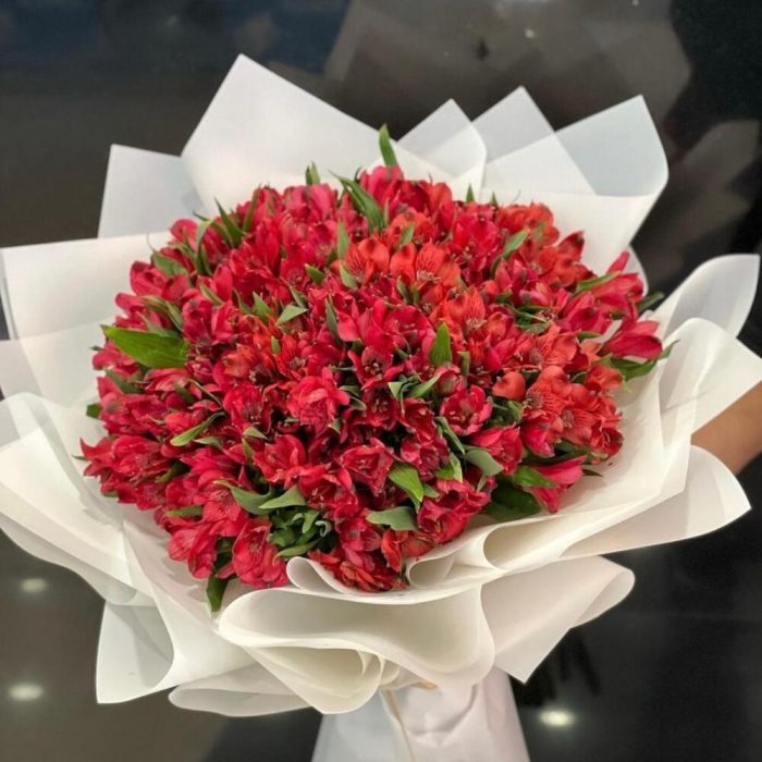 Альстромерия красная – 25 шт.Упаковка дизайнерская – 2 шт.Лента атласная – 2 шт.Открытка – 1 шт.инструкция по ухода за цветами – 1 шт.хорошее настроение – 100 шт.коробка переноска – 1 шт.Кризал – 1 шт.