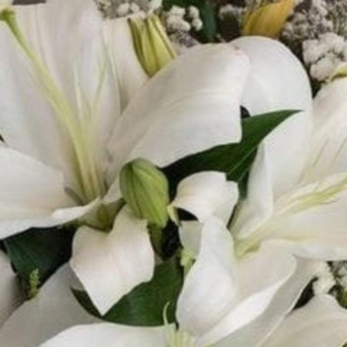 Лилия белая – 3 шт.Гипсофила – 3 шт.Фисташка пучок – 1 шт.Упаковка дизайнерская – 4 шт.