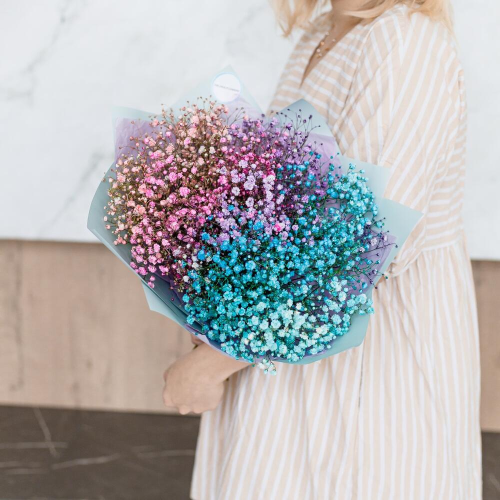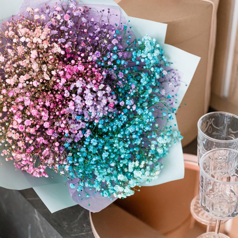 Гипсофила – 7 шт.Упаковка корейская – 2 шт.Лента атласная – 1 шт.