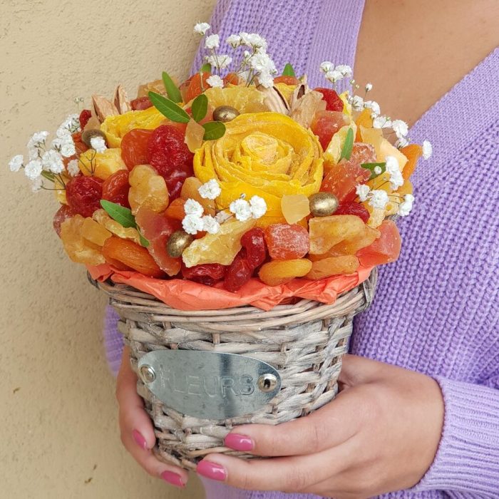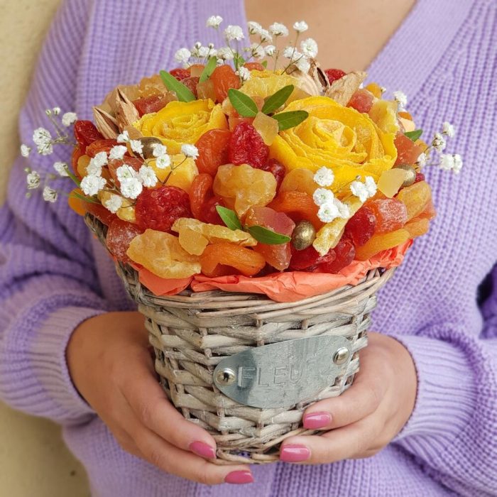 Гипсофила – 1 шт.Грецкий орех – 45 гр.Груша – 70 гр.манго – 148 гр.Папайя – 70 гр.Вишня – 25 гр.Курага – 152 гр.кизил – 68 гр.ананас кубики – 20 гр.миндаль в скорлупе – 15 гр.ананас вяленый – 55 гр.манговые конфеты – 3 шт.арахис в перламутре – 10 гр.кумкват в сахарной пудре – 60 гр.