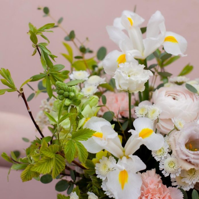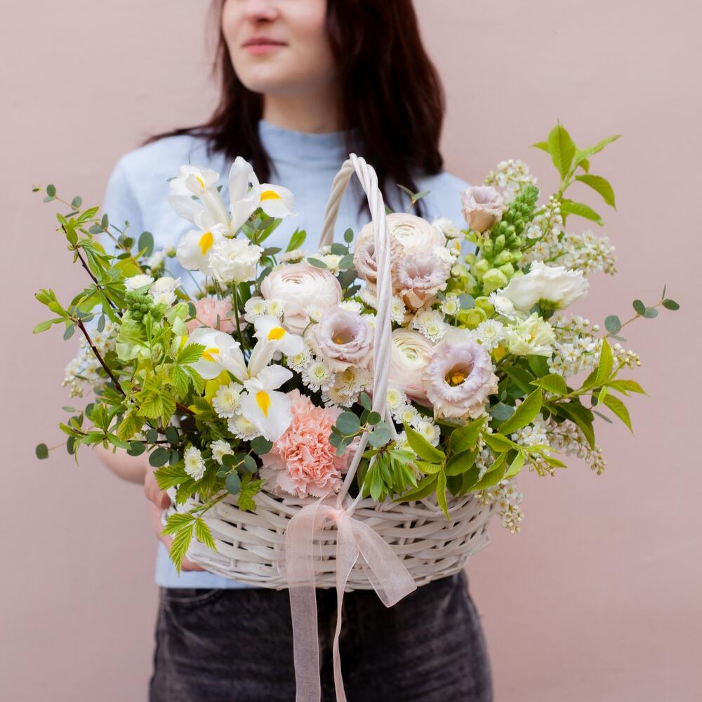 Корзина с цветами с ирисами и ранункулюсами