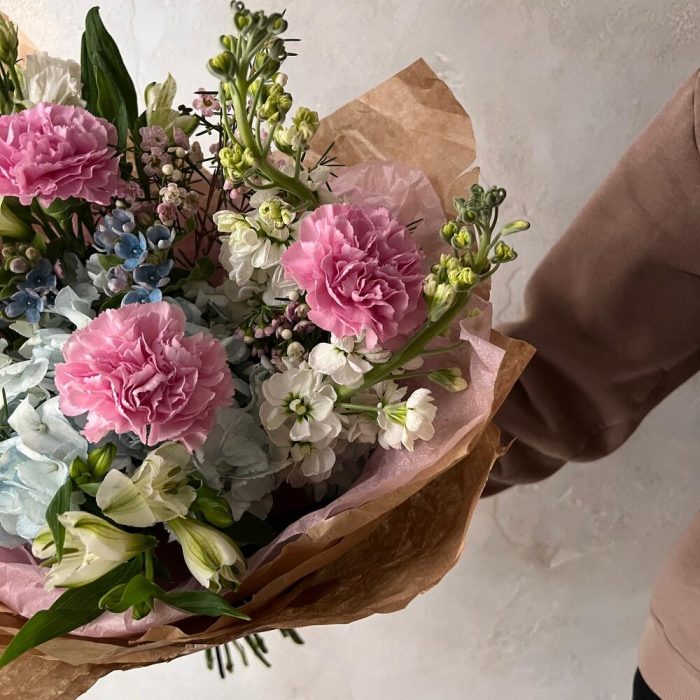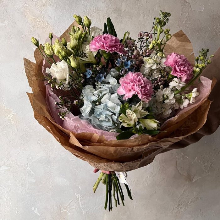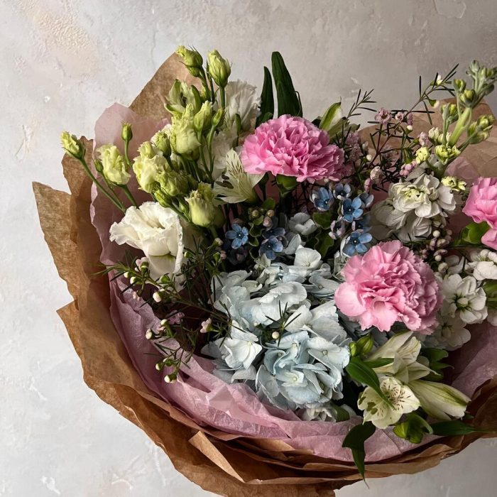 Альстромерия – 2 шт.Ваксфлауэр – 1 шт.Гвоздика розовая – 3 шт.Лизиантус белый – 2 шт.Упаковка дизайнерская – 1 шт.Гортензия голубая – 1 шт.Маттиола белая – 2 шт.оксипеталум голубой – 2 шт.