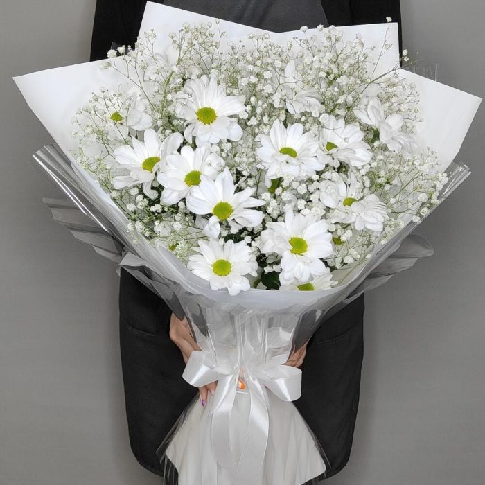 Букет из белоснежных ромашек и воздушной гипсофилы “Ромашки в снегу”