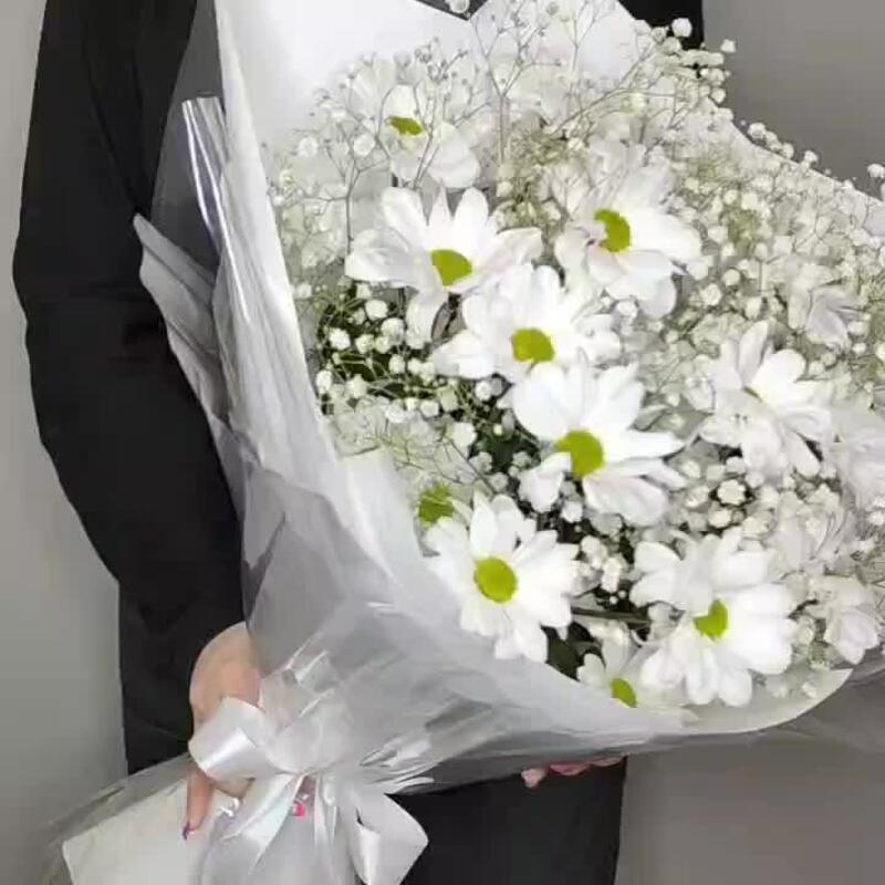 Лента атласная – 1 шт.Упаковка дизайнерская – 2 шт.Хризантема кустовая ромашковая – 3 шт.гипсофила белая – 2 шт.