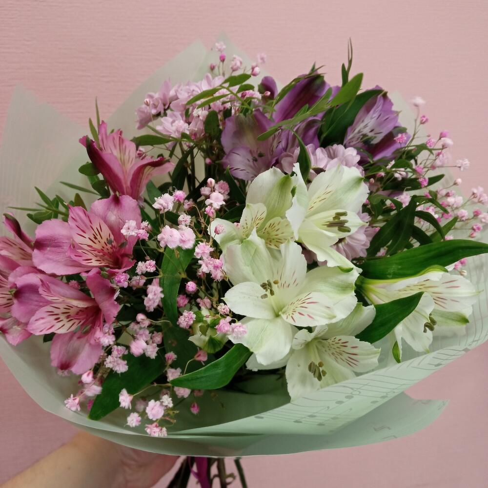 Букет с альстромериями, кустовой розой, гвоздикой и ваксфлауэром
