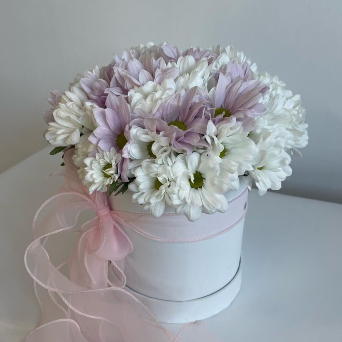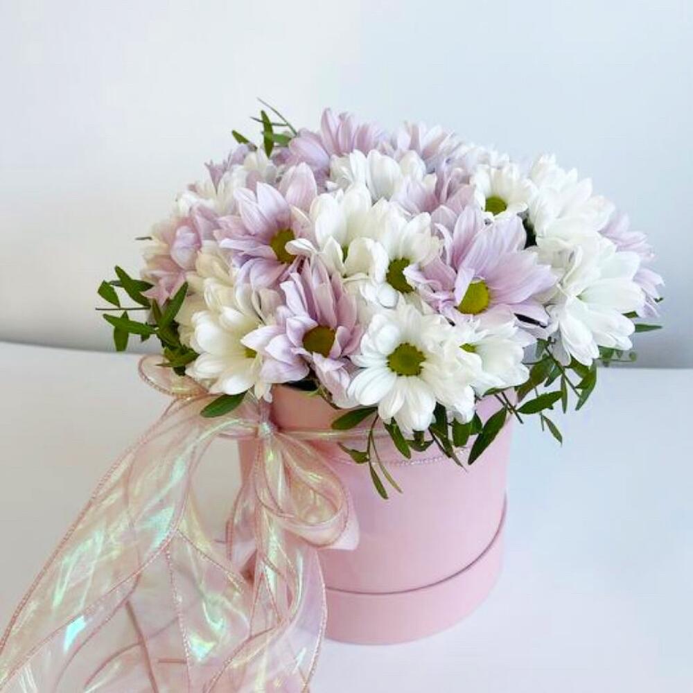 Нежная очаровательная композиция из хризантем в шляпной коробке – отличный комплимент для близкого человека. Свежие ароматные цветы станут приятным сюрпризом и подарят прекрасное настроение.Уважаемые покупатели! Пожалуйста обратите ваше внимание на размер композиции при заказе! Он учитывается вместе с упаковкой Чтобы наши прекрасные композиции дольше радовали получателя рекомендуем вам:⭐Не вынимать цветы из коробки/корзинки⭐Поливать композицию каждый день (воду нужно вливать в центр, чтобы вода правильно распределилась) ⭐Не ставить цветы у отопительных приборов и на сквозняке