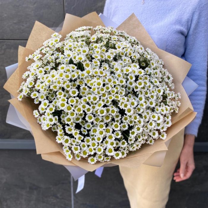 Пышный букет с нежными сантини, оформленный в крафт – романтично и очаровательно К букету вы так же можете добавить открытку с вашими пожеланиями, воздушный шар в виде сердца, коробочку Raffaello или мягкую игрушку