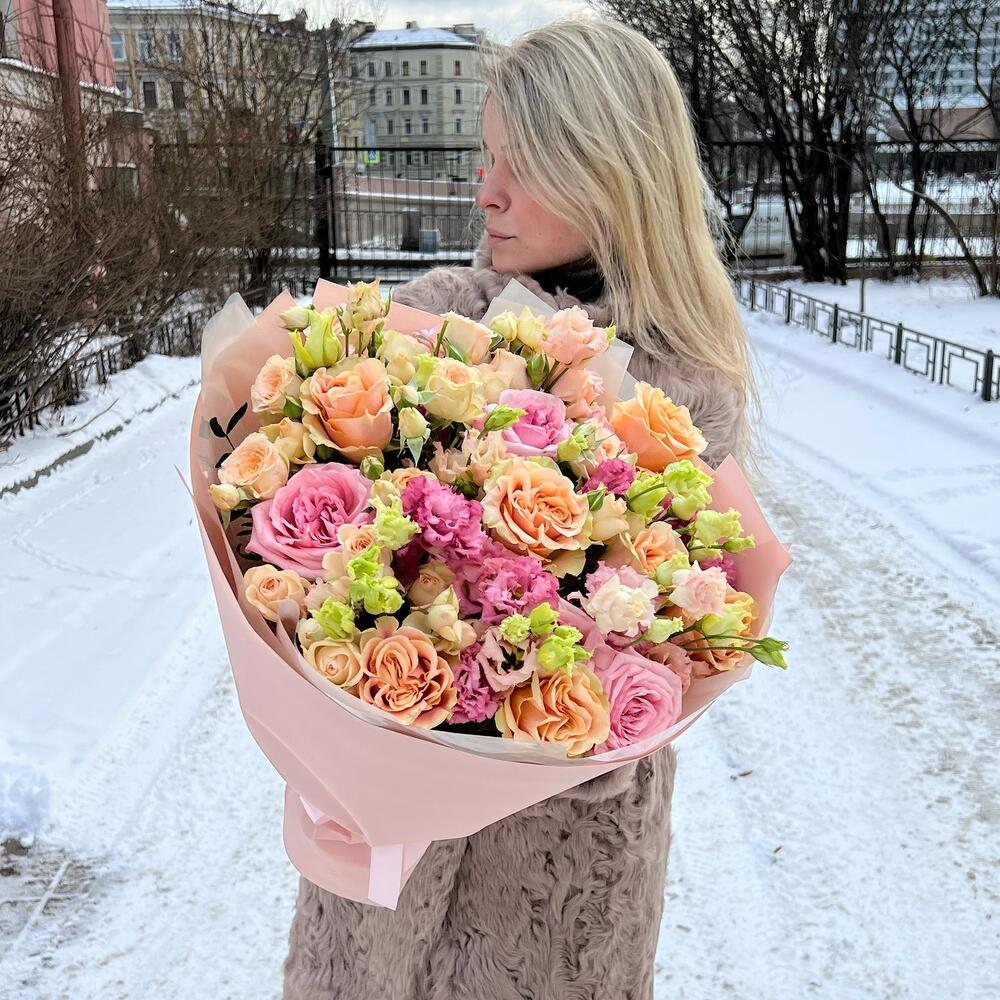 розовые пионовидные розы – 7 шт.персиковые пионовидные розы – 7 шт.садовые кустовые розы – 5 шт.Махровый лизиантус – 5 шт.Дизайнерская упаковка – 1 шт.тематическая открытка – 1 шт.