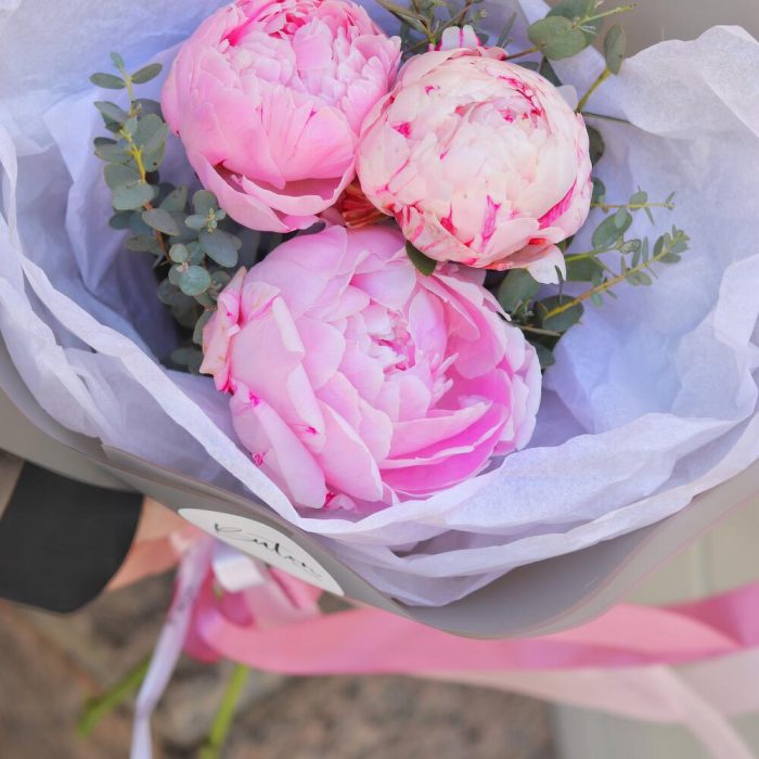 Эвкалипт – 1 шт.Пион Сара Бернар – 3 шт.Открыточка с вашими пожеланиями – 1 шт.Шоколадка – 1 шт.Дизайнерская упаковка – 1 шт.