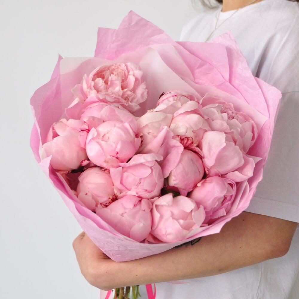 Лента атласная – 1 шт.Упаковка дизайнерская – 2 шт.Пион розовый – 15 шт.