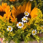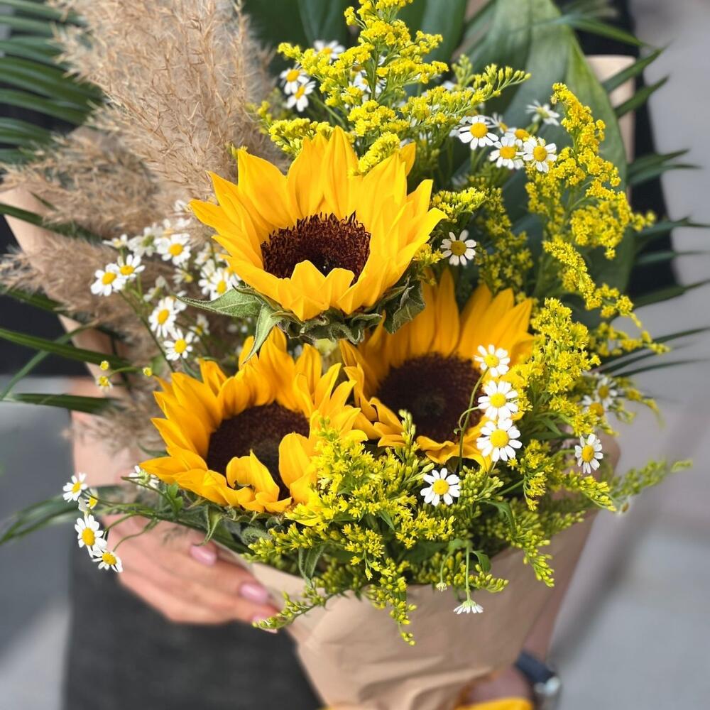 Робелини – 2 шт.Монстера – 1 шт.пампас кортадерия – 1 шт.Подсолнух – 3 шт.Солидаго желтое – 4 шт.Матрикария – 3 шт.Упаковка дизайнерская – 2 шт.Лента атласная – 1 шт.