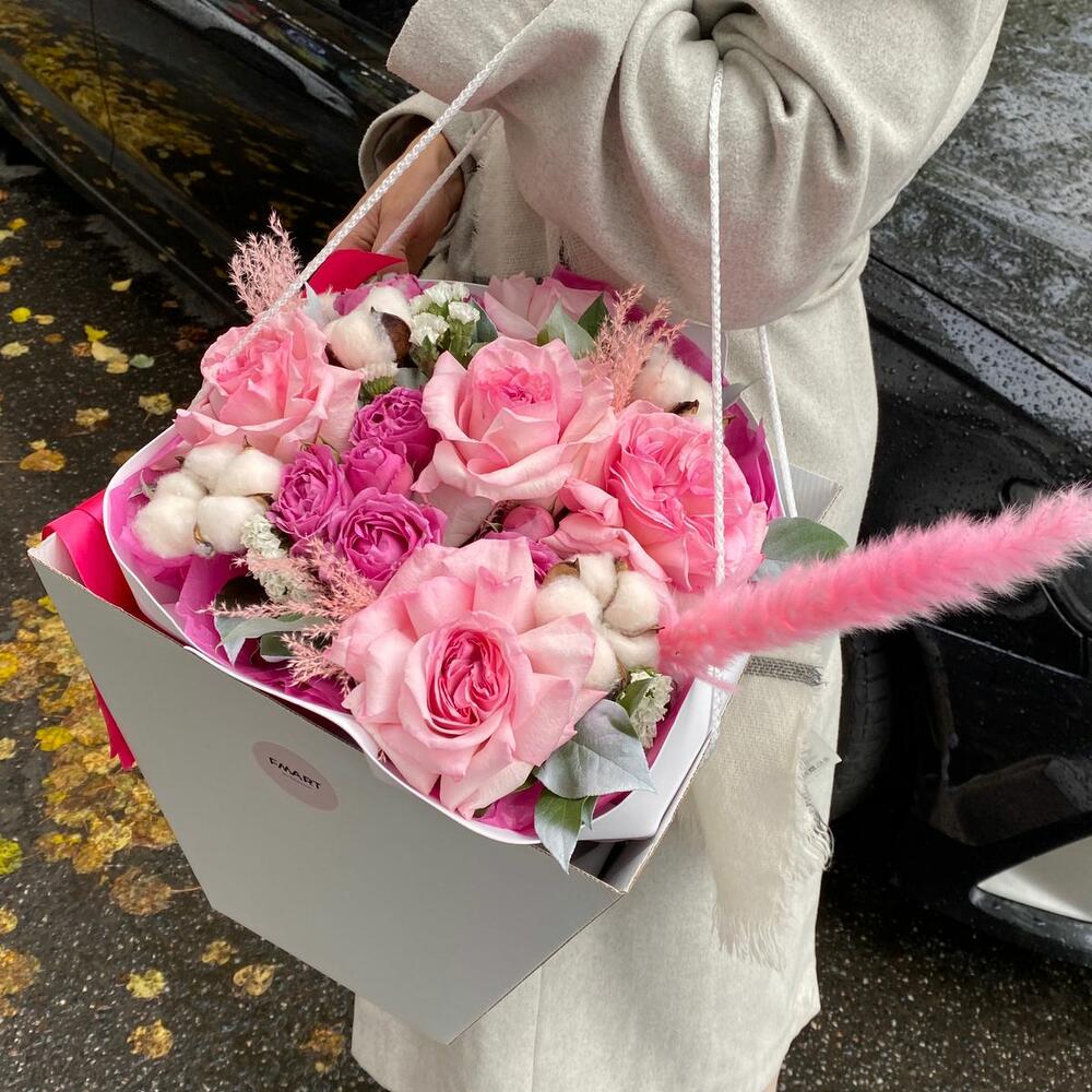 Роза – 5 шт.камыш декоративный – 1 шт.Хлопок – 5 шт.Роза пионовидная кустовая – 3 шт.Упаковка – 4 шт.Салал – 5 шт.Статица – 2 шт.мискантус – 4 шт.Сумка крафт – 1 шт.