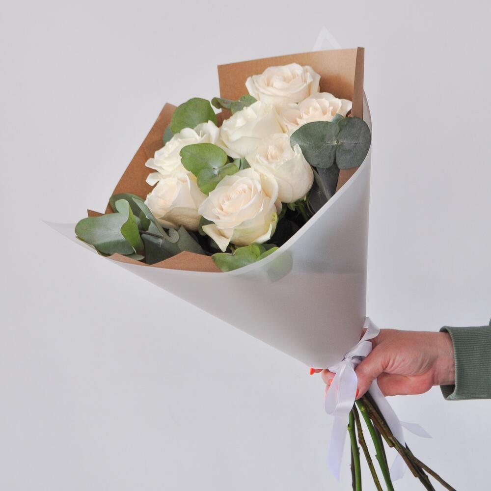 Белые розы и Эвкалипт ( 7 штук )