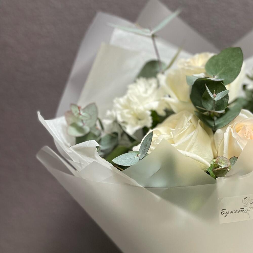 Букет «Арктика»(Роза Ароматная premium О Хара,диантус(гвоздика),эвкалипт )