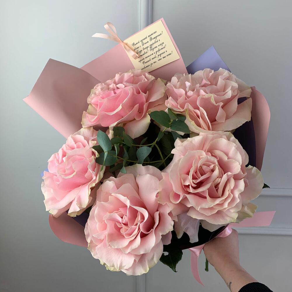Лента – 1 шт.Эвкалипт – 2 шт.Матовая пленка – 1 шт.Роза пинк мондиаль – 5 шт.