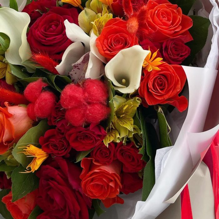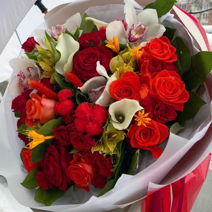 Роза Россия – 12 шт.Кустовая роза красная – 9 шт.орхидея белая цимбидиум – 4 шт.Калла белая – 3 шт.Альстромерия – 6 шт.Хлопок натуральный – 3 шт.Салал пучок – 1 шт.Тишью белое – 6 шт.Пленка матовая – 8 шт.