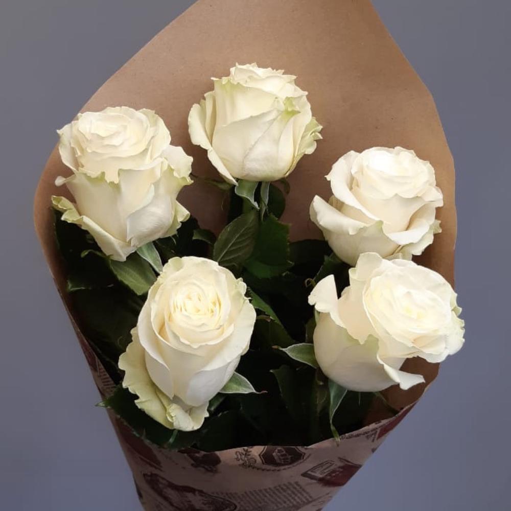 Роза – 5 шт.Лента атласная – 1 шт.Крафт упаковка – 1 шт.