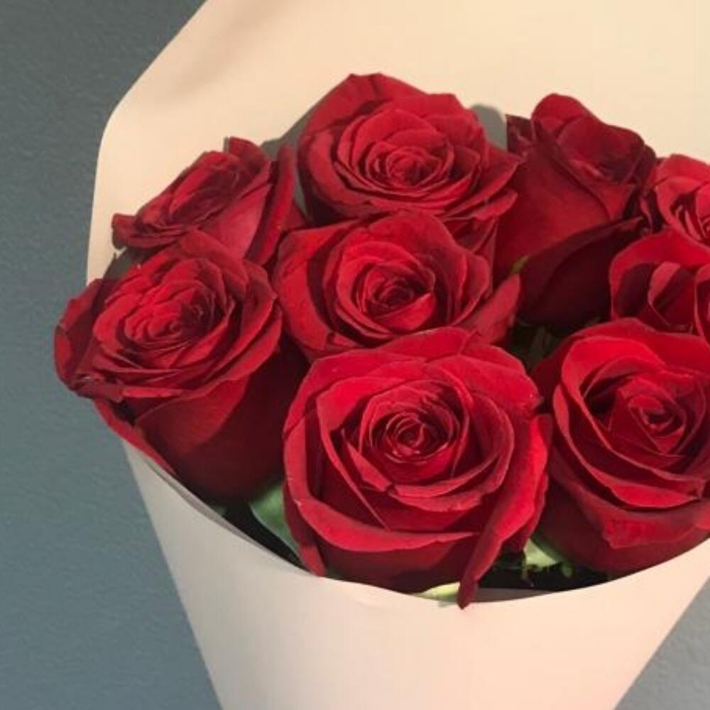 Роза красная – 9 шт.Лента атласная – 1 шт.Упаковка дизайнерская – 1 шт.
