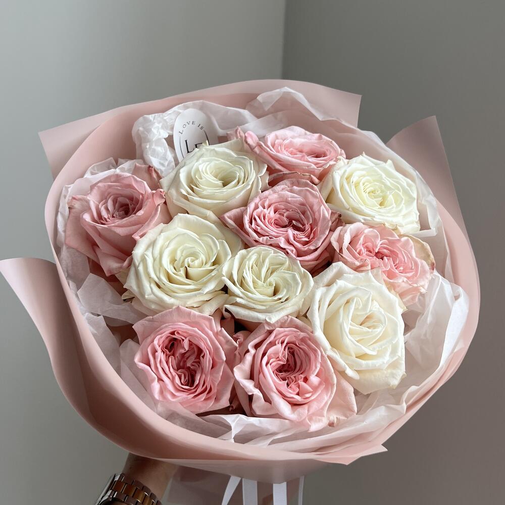 роза пионовидная плая бланка – 5 шт.пленка матовая полупрозрачная – 1 шт.тишью белая хрустящая – 1 шт.роза питновидная pink o’hara – 6 шт.