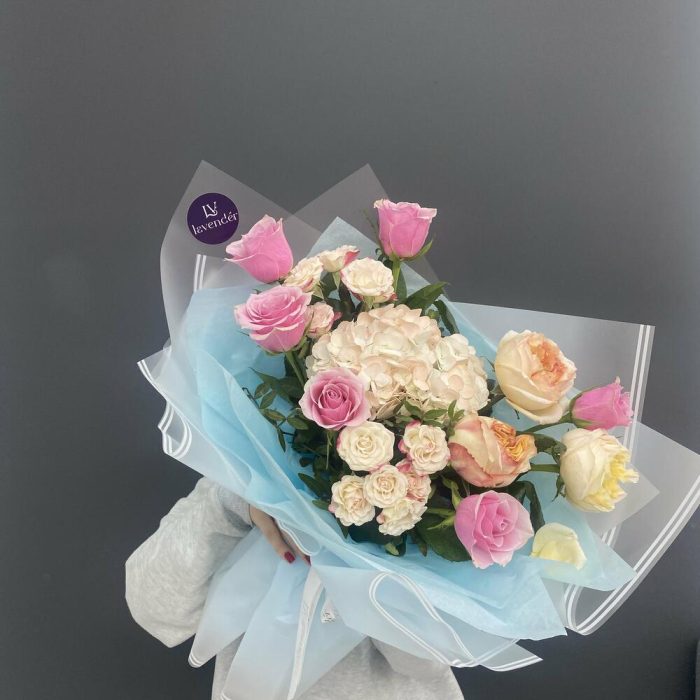“Эвкалиптическая роскошь” гортензия и пионовидная кустовая роза