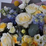 Букет с дельфиниумом и пионовидными розами «Мечты о море»