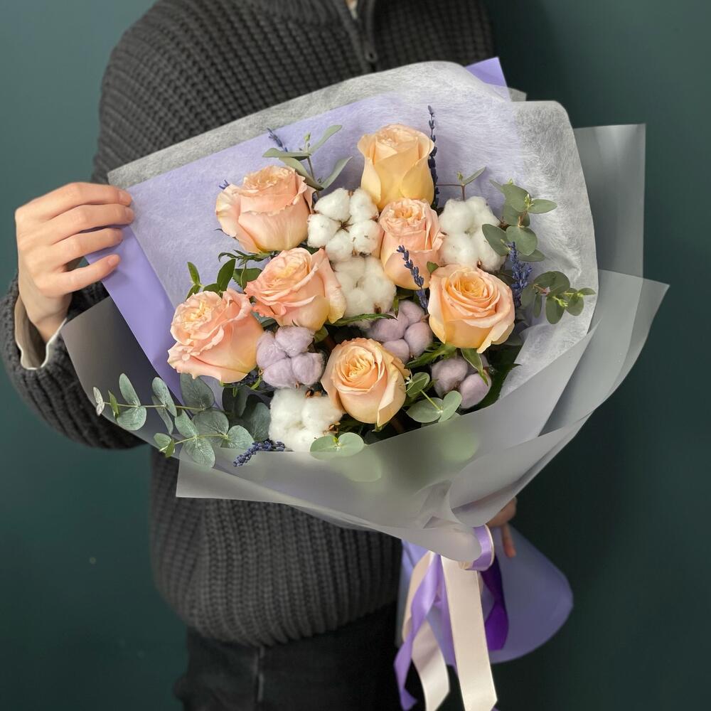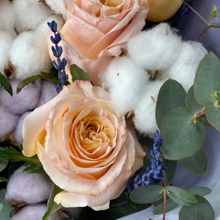 Лаванда – 7 шт.Лента – 1 шт.Хлопок – 7 шт.Эвкалипт – 2 шт.Роза одноголовая – 7 шт.бумага упаковочная – 1 шт.