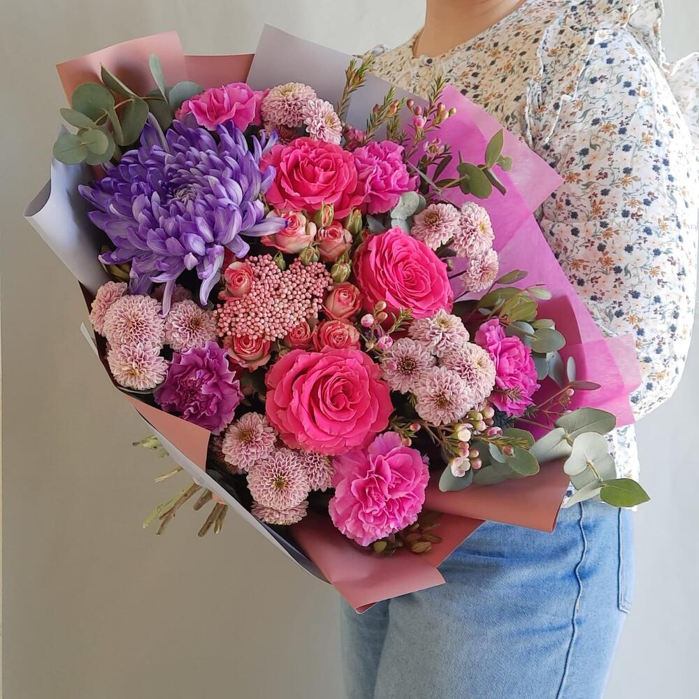 Роза – 3 шт.Хризантема – 1 шт.Сантини – 5 шт.Роза кустовая – 1 шт.Озотамнус – 1 шт.Ваксфлауэр – 2 шт.Диантус – 5 шт.Эвкалипт – 3 шт.Фисташка – 5 шт.Упаковка дизайнерская – 2 шт.Лента атласная – 1 шт.