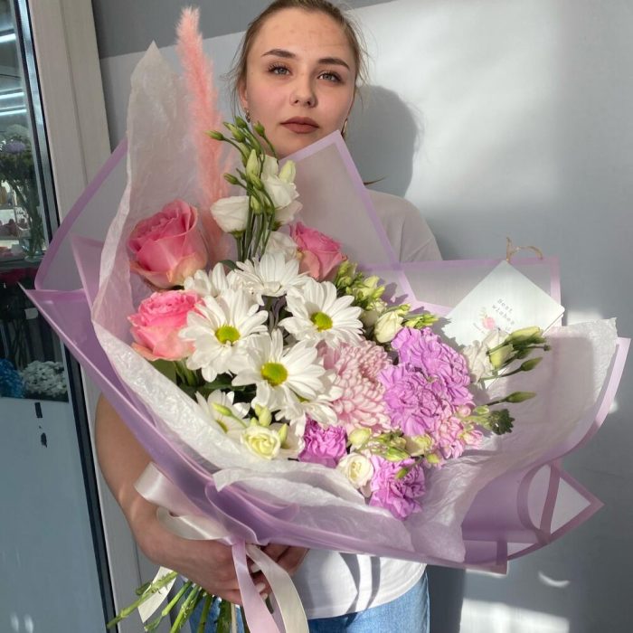 Маттиола – 1 шт.Хризантема кустовая – 1 шт.Роза – 3 шт.Упаковка – 4 шт.Эустома – 5 шт.Лента атласная – 3 шт.Хризантема одноголовая – 1 шт.Диантус лунный – 5 шт.пампасная трава – 1 шт.