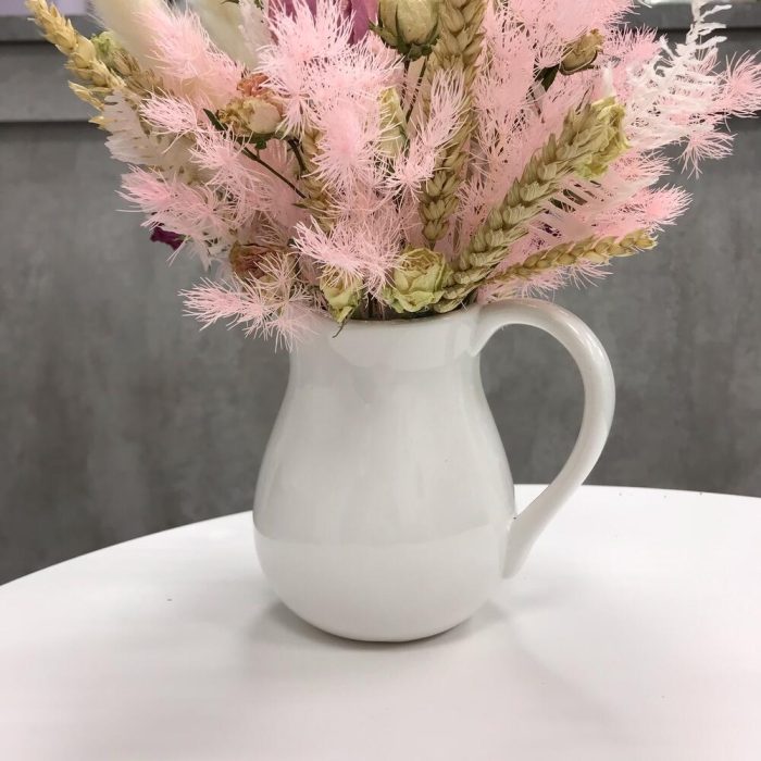 кувшин керамика – 1 шт.Оазис флористический – 1 шт.камыш сухоцвет – 1 шт.роза кустовая засушенная – 5 шт.Колосья – 9 шт.аспарагус стабилизированный – 3 шт.листья стабилизированные – 1 шт.