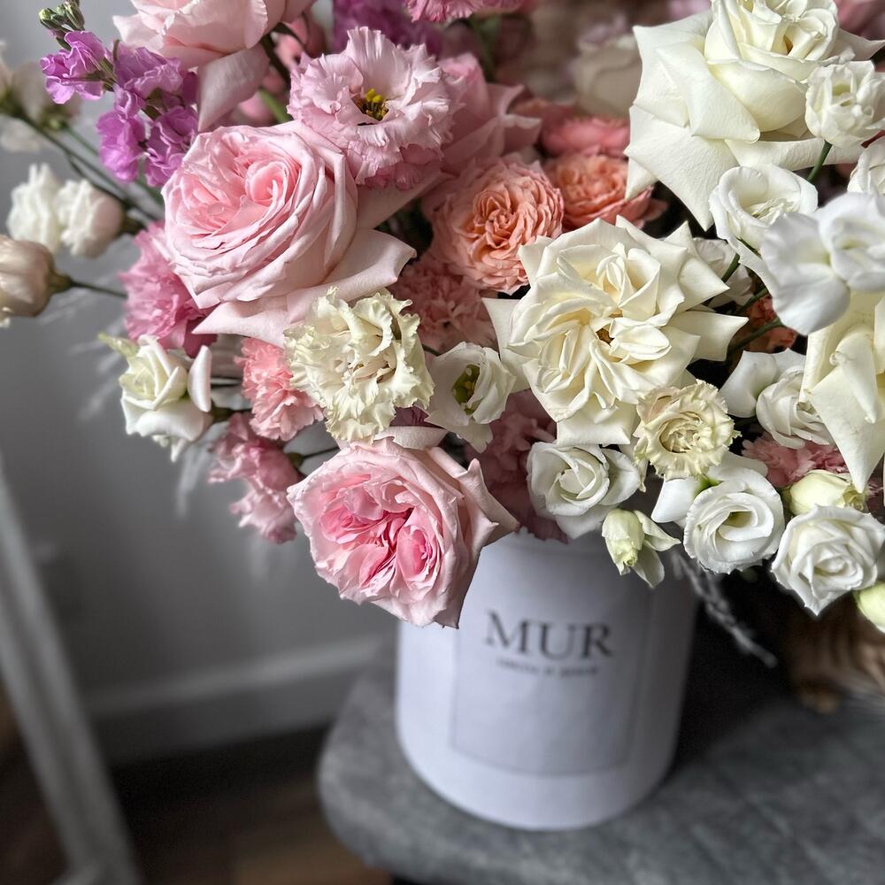 Маттиола – 5 шт.Диантус – 18 шт.Коробка шляпная – 1 шт.Лизиантус Алиса белый – 5 шт.Оазис флористический – 2 шт.Лизиантус алиса пинк – 7 шт.джульетта роза пионовидная – 5 шт.пампасная трава – 5 шт.плая бланка роза – 9 шт.pink o’hara роза – 11 шт.