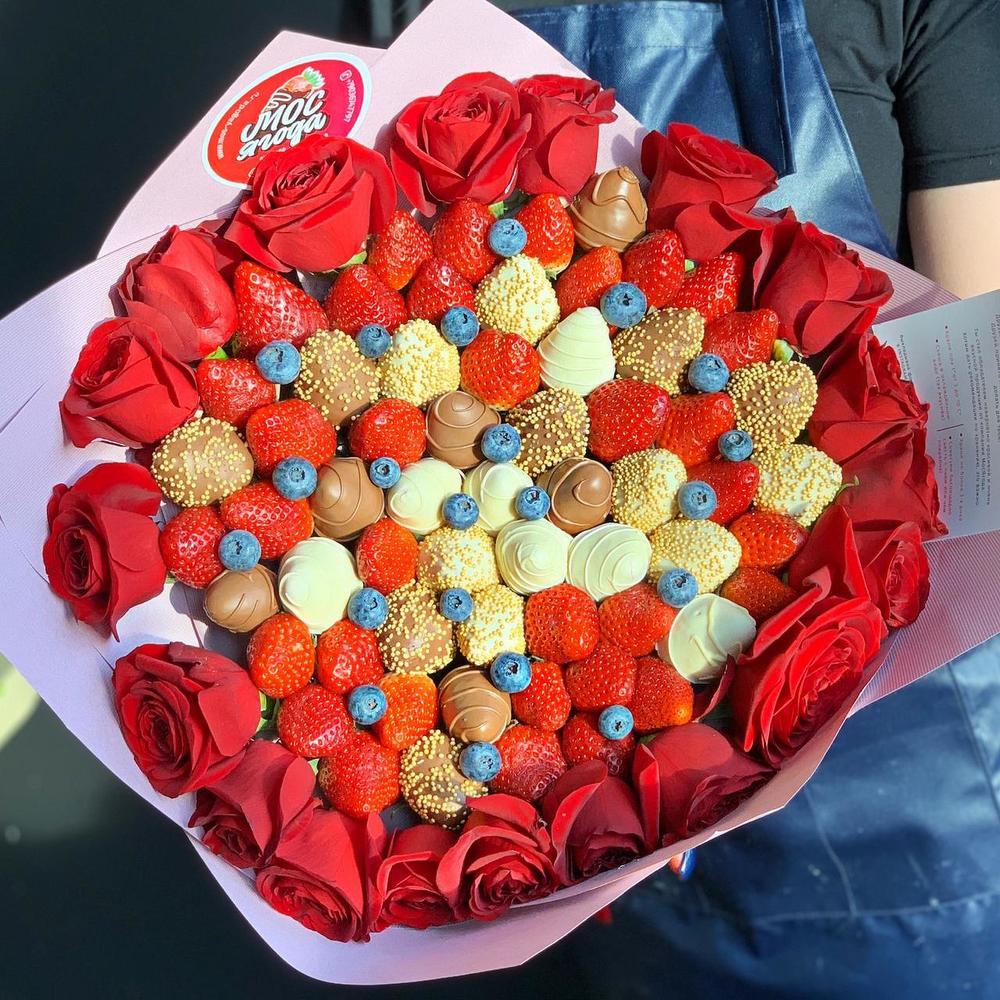 Клубника – 30 шт.Клубника в шоколаде callebaut (бельгия) – 43 шт.Роза – 15 шт.Голубика – 10 шт.