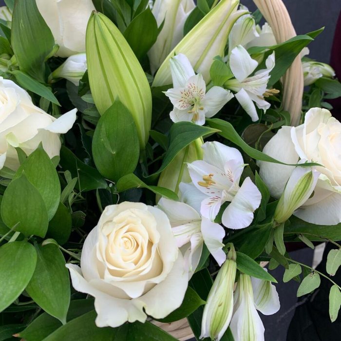 Корзина с белыми розами, лилиями и альстромериями «Весенний сад»