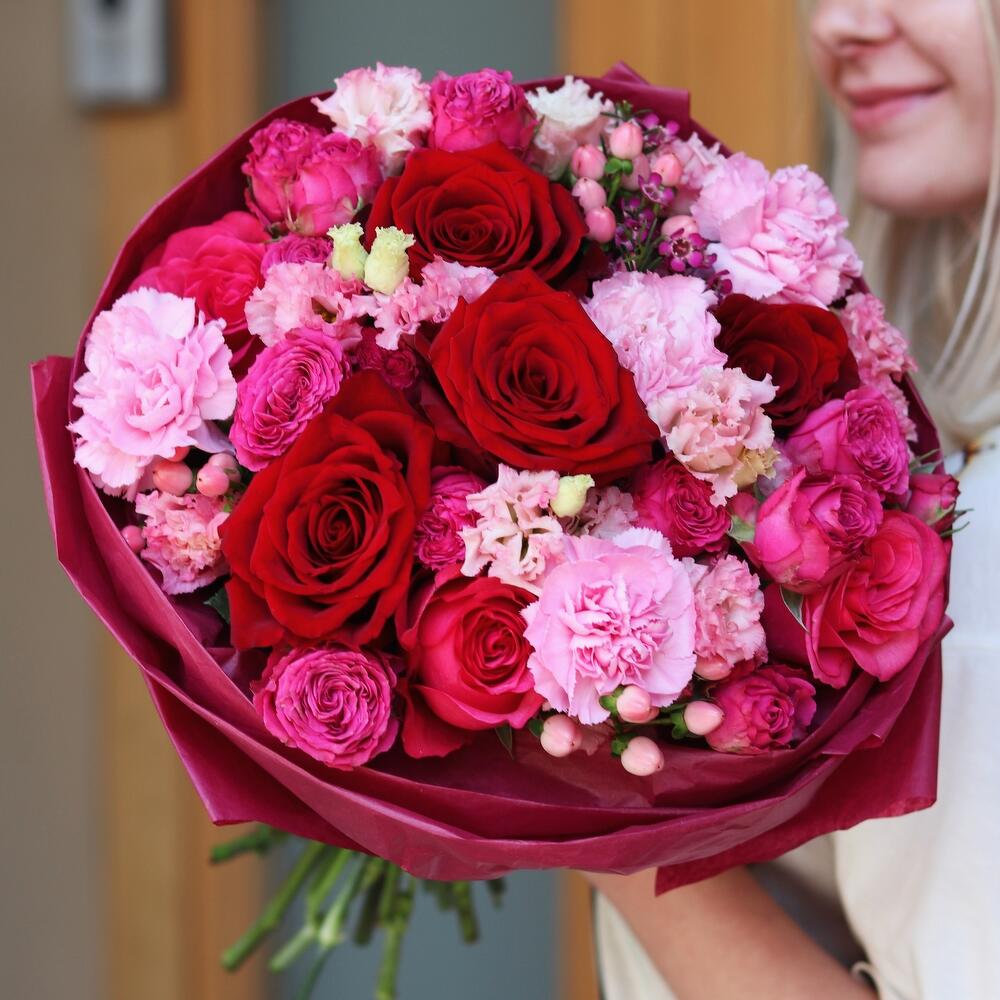 Роза красная – 4 шт.Гвоздика – 4 шт.Гиперикум – 3 шт.Ваксфлауэр – 1 шт.Роза малиновая – 3 шт.Роза кустовая – 3 шт.Лизиантус – 2 шт.Открыточка с вашими пожеланиями – 1 шт.Шоколадка – 1 шт.инструкция по уходу за цветами – 1 шт.подкормка для срезанных цветов – 1 шт.