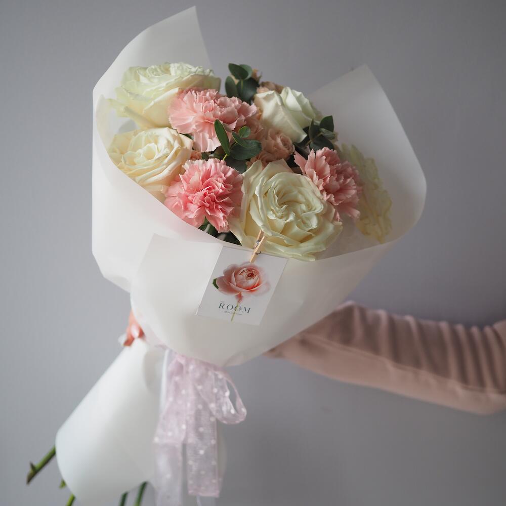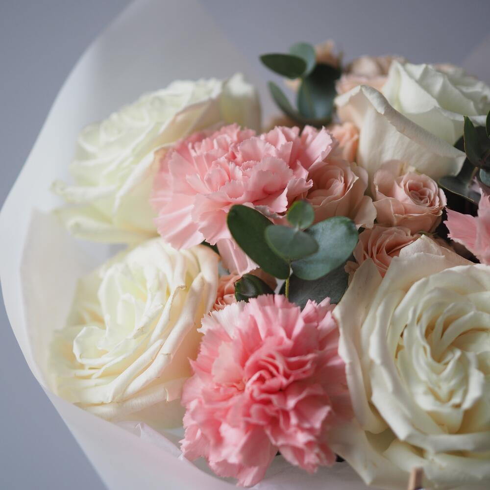 Эвкалипт – 1 шт.Роза – 5 шт.Кустовая роза – 2 шт.Упаковка – 1 шт.Гвоздика – 3 шт.