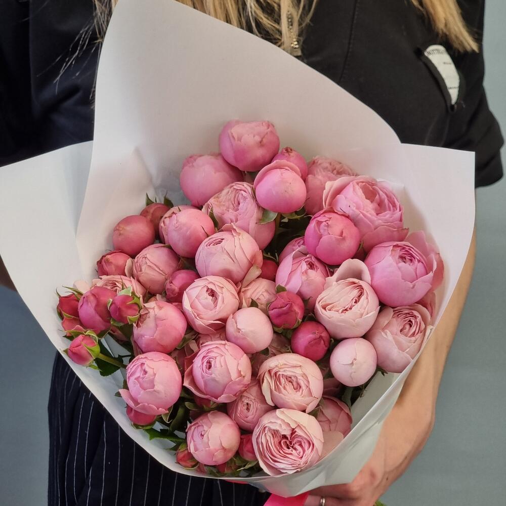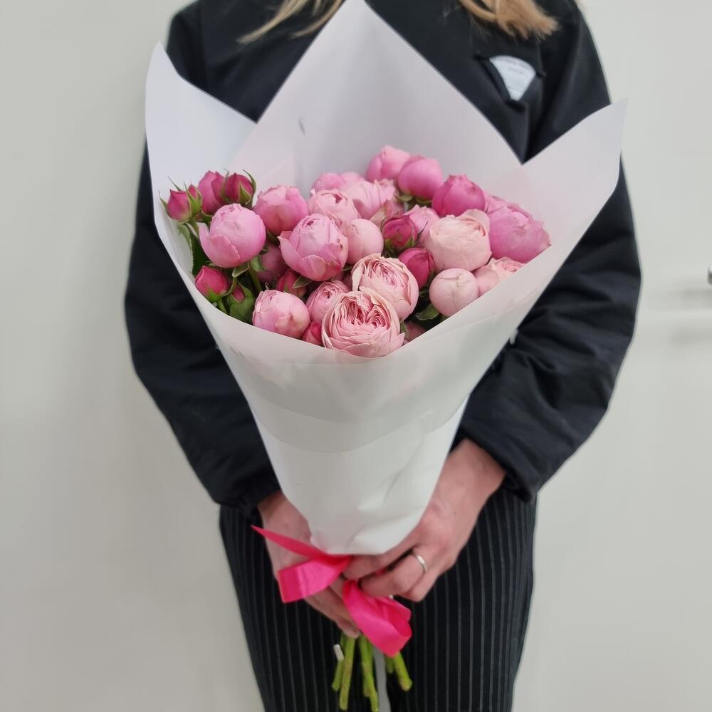 Лента атласная – 1 шт.Пленка матовая – 1 шт.silva pink кустовая роза – 5 шт.
