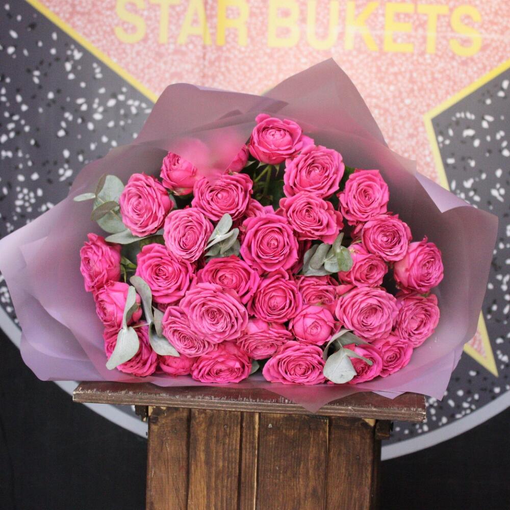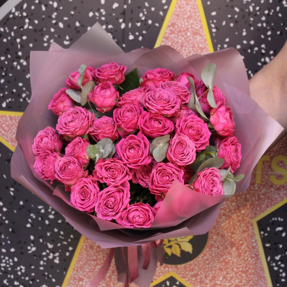 роза кустовая пионовидная классик сенсейшн – 9 шт.Эвкалипт – 3 шт.Пленка дизайнерская – 4 шт.Лента атласная – 1 шт.