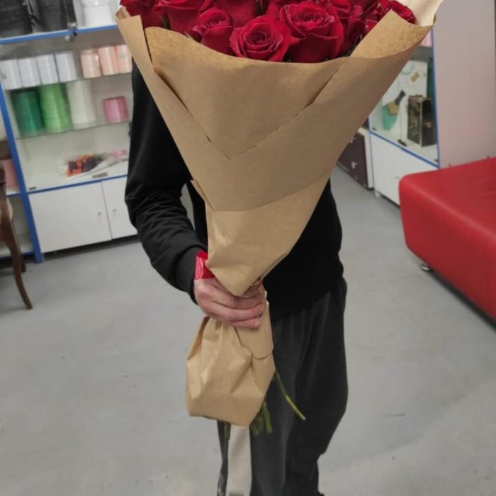 розы красные эквадор 70 см – 25 шт.Крафт дизайнерский – 2 шт.Лента – 1 шт.