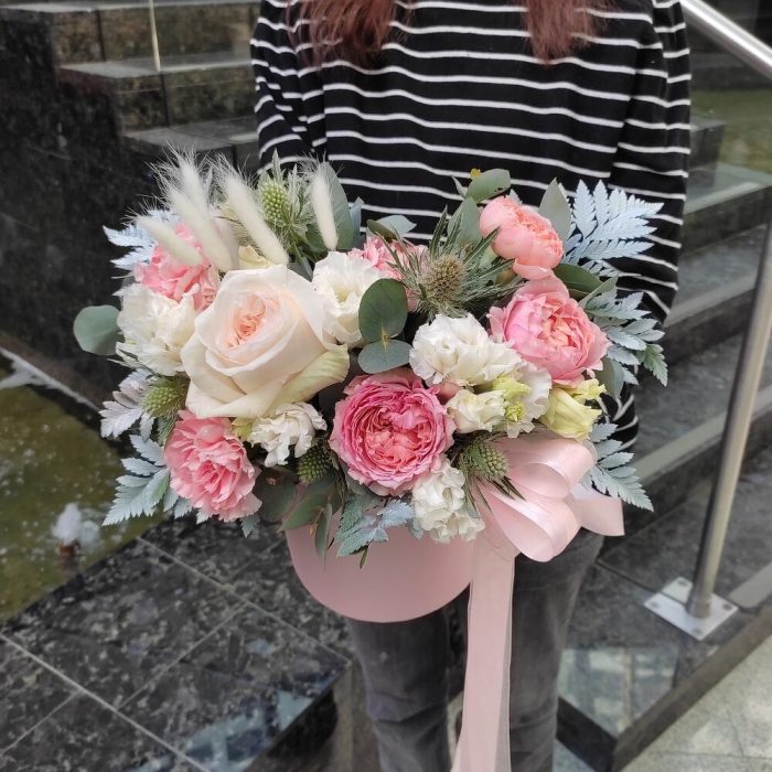 Папоротник – 3 шт.джульетта кустовая роза пионовидная – 1 шт.Диантус – 3 шт.Коробка шляпная – 1 шт.Эвкалипт – 1 шт.Эрингиум – 1 шт.Лизиантус белый – 2 шт.