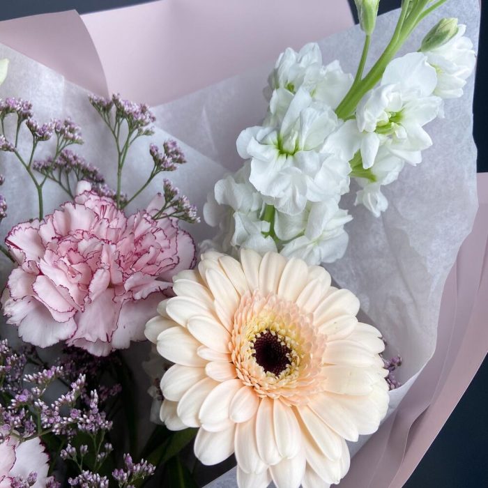 Стильный букет с кремовыми розами,необычными гвоздиками,соцветиями лимониума и ароматной маттиолой для современных и стильных девушек