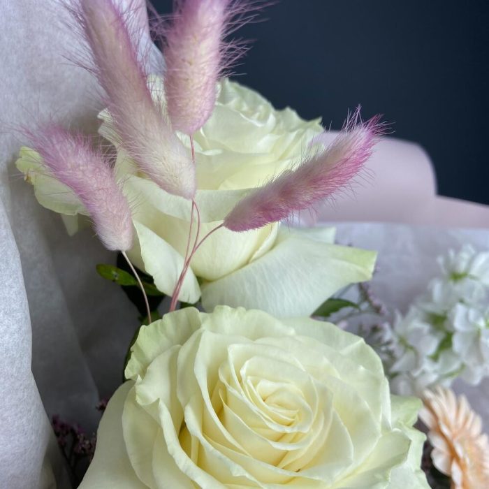 Роза белая мондиаль – 2 шт.Гербера мини – 1 шт.Гвоздика – 2 шт.Лимониум сиреневый – 1 шт.Маттиола белая – 1 шт.Лагурус (сухоцвет) – 4 шт.