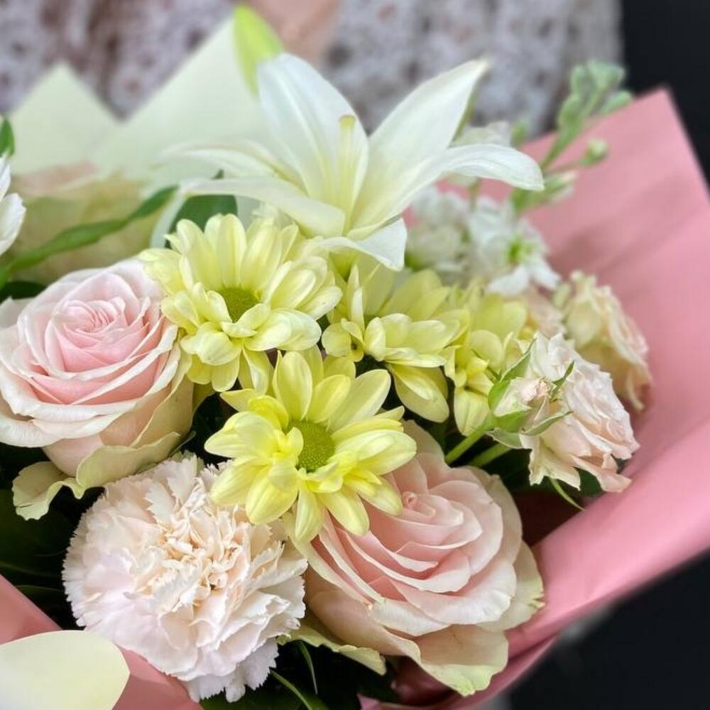 Роза – 3 шт.Гвоздика кустовая – 2 шт.Альстромерия – 1 шт.Роза кустовая – 1 шт.Лилия – 1 шт.Зелень – 1 шт.