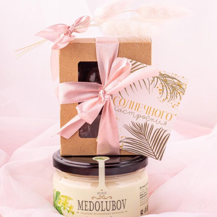Фундук в шоколаде – 150 гр.Мини открытка – 1 шт.букетик из сухоцветов – 1 шт.мед-суфле липовый с мятой – 250 мл