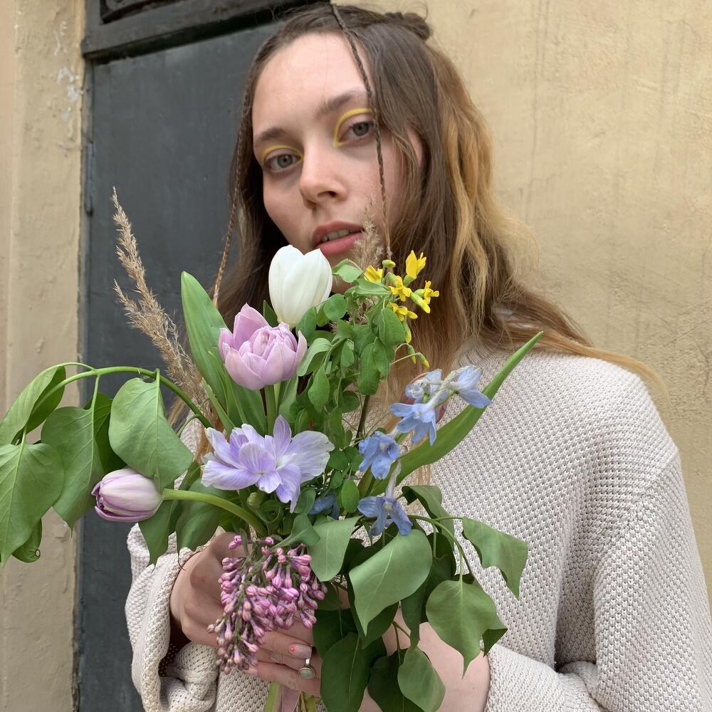 Анемон – 1 шт.Дельфиниум – 1 шт.Колосья – 2 шт.Тюльпан белый – 1 шт.полевая зелень – 1 шт.тюльпан катинка – 3 шт.