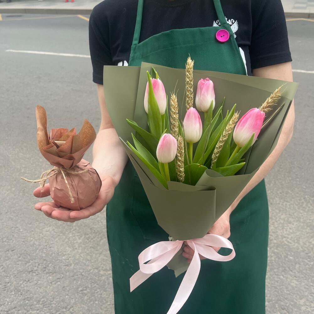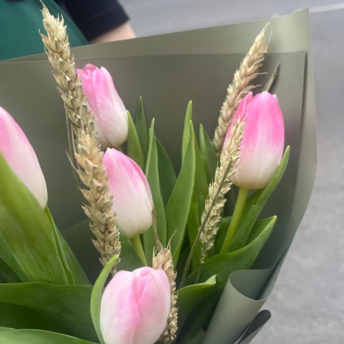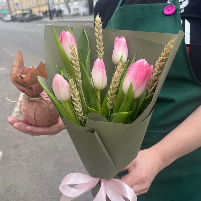 РОЗОВАЯ СВЕЖЕСТЬ оригинальный набор из тюльпанов с пшеницей и ароматным яблоком